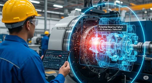 क्या है यह: यह एक ऐसा तरीका है जिसमें AI, मशीनों से आने वाले डेटा (जैसे कंपन, तापमान, दबाव) का विश्लेषण करता है ताकि यह पता लगाया जा सके कि मशीन कब खराब हो सकती है। यह मशीन के खराब होने से पहले ही मेंटेनेंस की जरूरत बता देता है, जिससे बड़े नुकसान से बचा जा सकता है।
